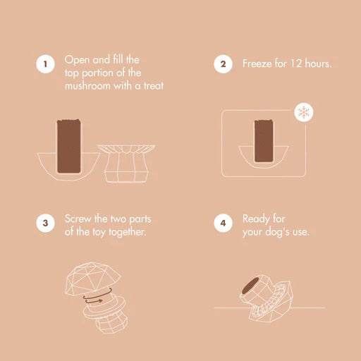 The Mushroom treat dispensing dog toy is designed for mess-free frozen treats. Part of the Super Veggiez collection, it has a flat top to add peanut butter, yogurt, or broth-based wet treats. Freeze the toy for 12 hours and it is ready for your dog. Made from durable, non-toxic natural rubber, it’s a great way to cool your dog down and extend playtime. Ideal for dogs who love licking, chewing, and staying engaged.
