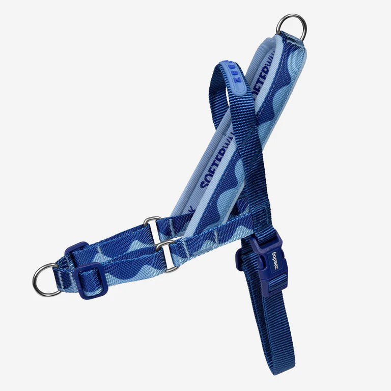 The Swell SofterWalk Harness is a no-pull dog harness that's designed to give both your dog and you a smoother, comfortable walk. This two-tone blue dog harness comes with two D-rings - one on the back and one on the front, which helps guide the dog towards you when they try to pul and is great for dogs that pull.
