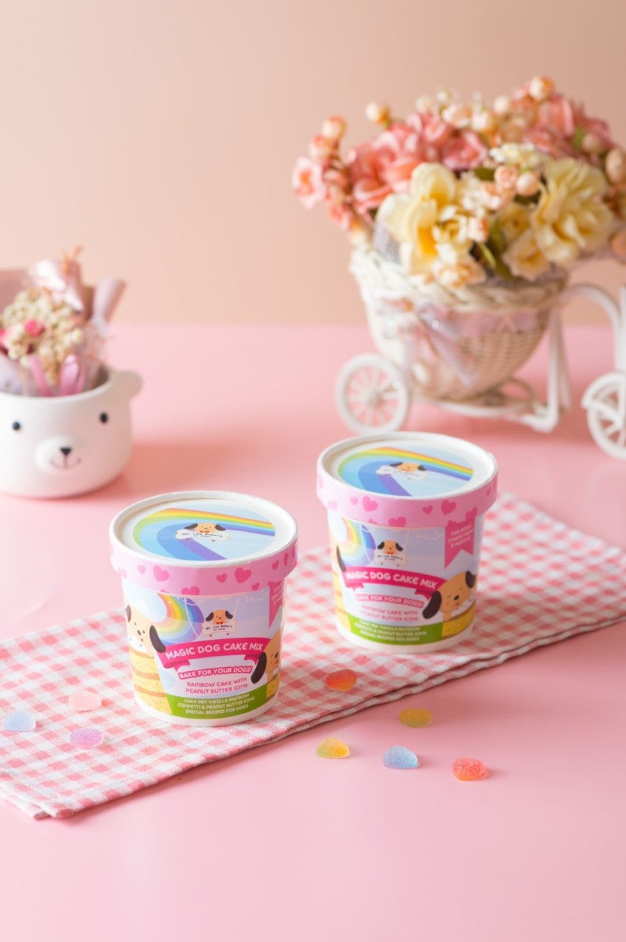 Cake mix vanilla rainbow confetti and peanut butter icing. Special cake mix formulated for your dogs. You can make your own cake at home for your dog.
